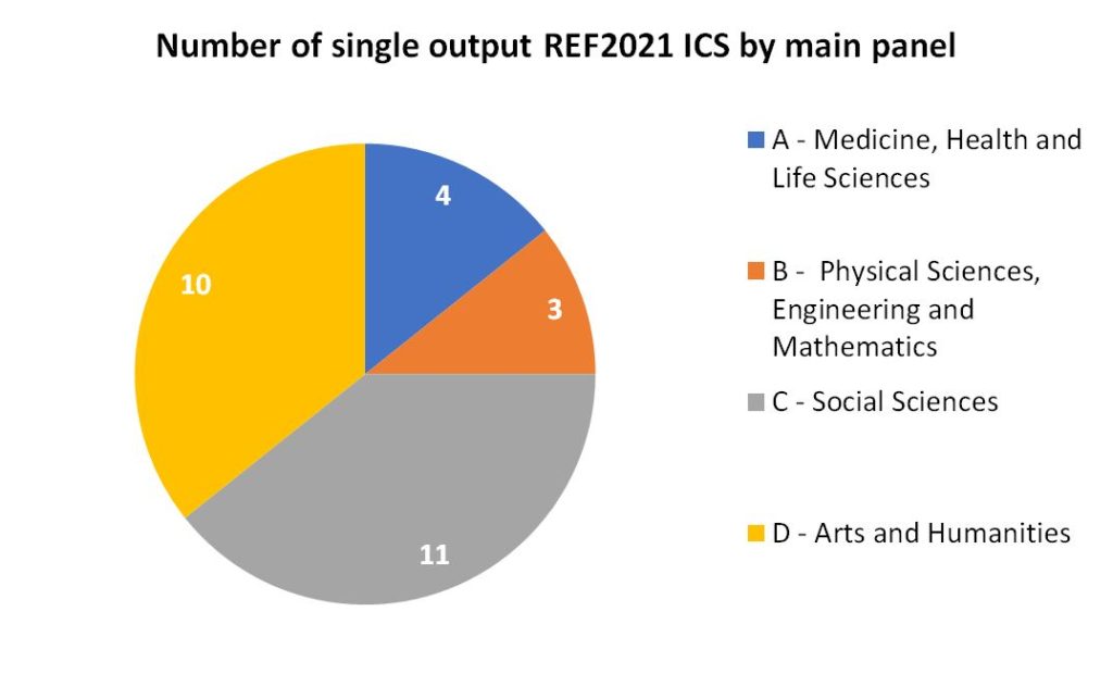 - I found 28 single output ICS in the REF2021 database. There are 6361 ICS in the database (out of a total of 6781 submitted so a few hundred aren’t publicly available). So 0.44% of the publicly available 6361 ICS are single output.